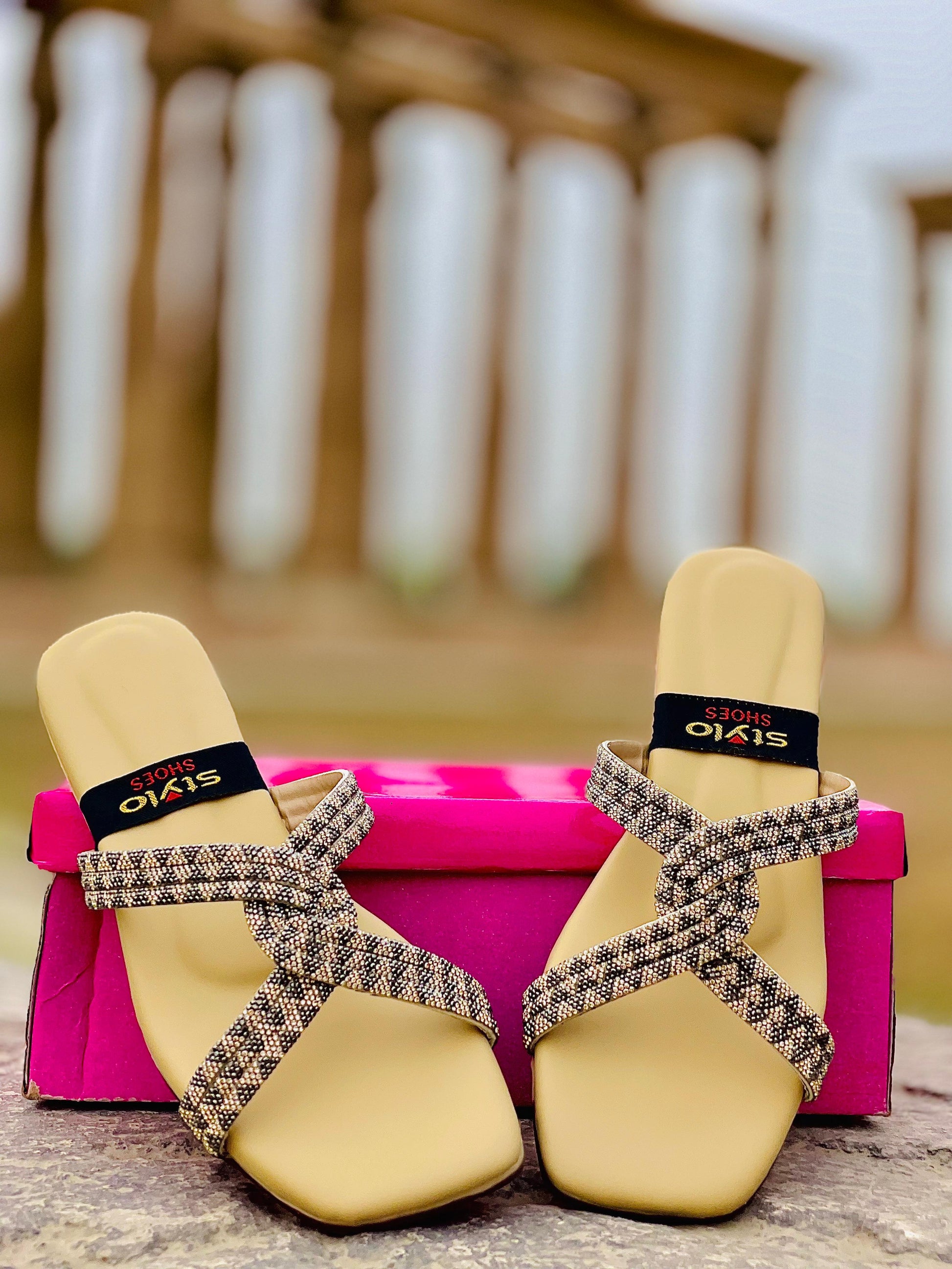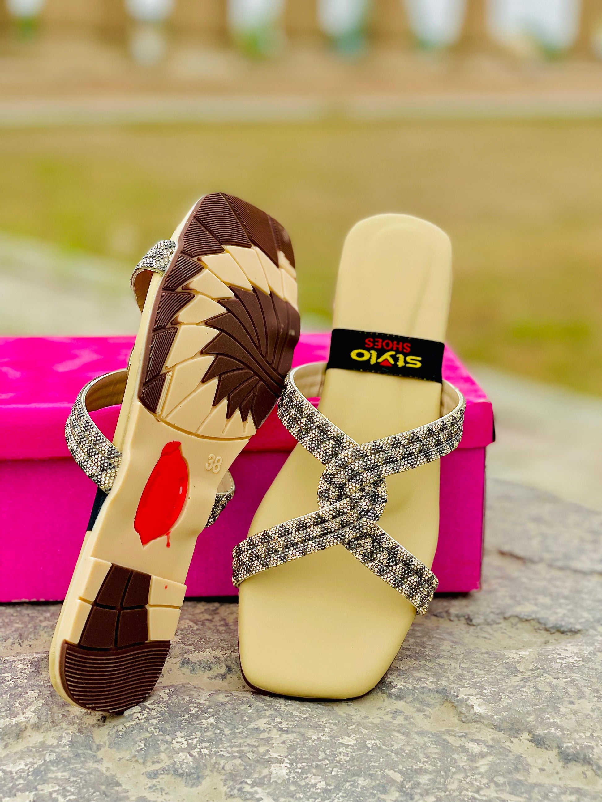 Step into elegance with these beautifully designed beige slippers featuring sparkling cross straps. Perfect for casual outings or festive occasions, these slippers combine comfort, style, and durability. The soft sole ensures all-day comfort, while the non-slip bottom gives you added grip and confidence with every step.