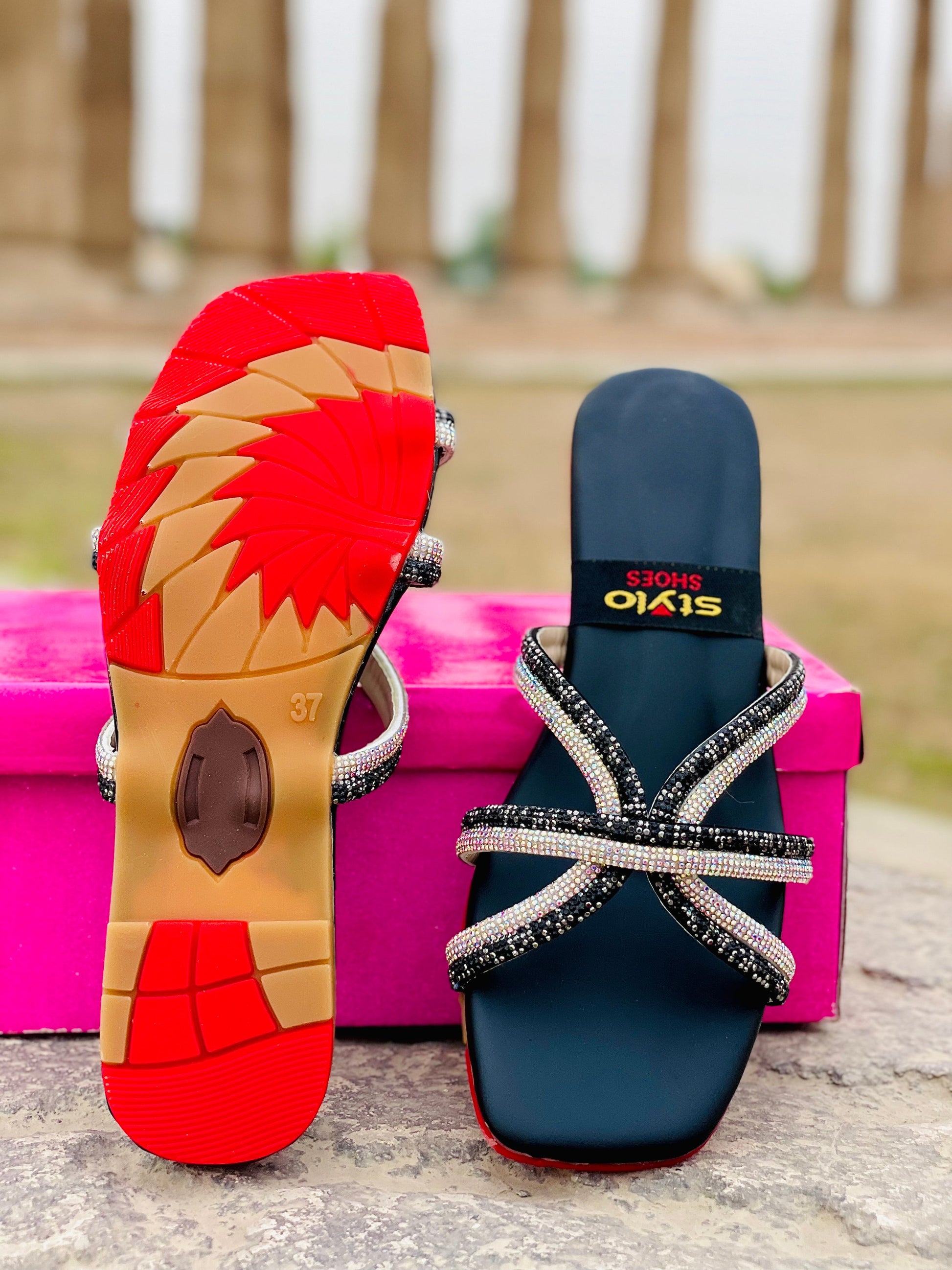 Elevate your everyday look with these stylish black sandals featuring elegant beaded cross straps. Comfortable, trendy, and perfect for all-day wear.
